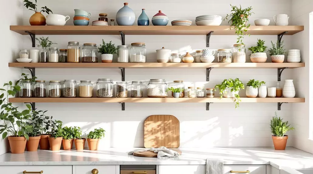 If you have open shelves (or can remove a few cabinet doors), curate a display with dishes, plants, and cookbooks. This adds character and makes the space feel designed.